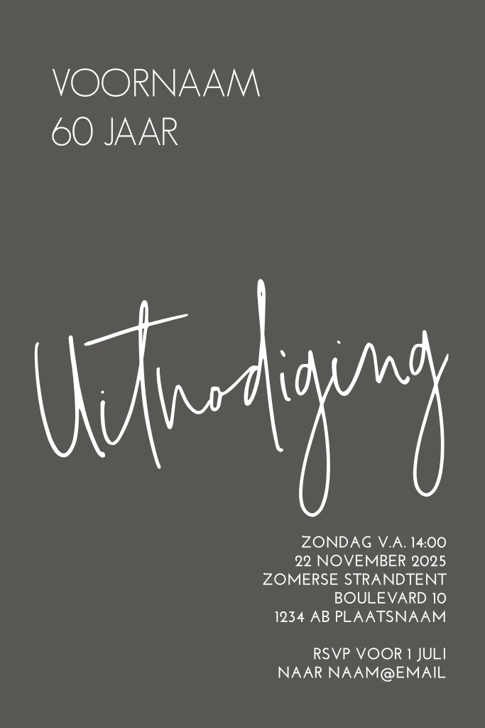 Een chique uitnodiging voor je verjaardag met echte zilver foliedruk. Alles op deze uitnodiging, zoals teksten en kleuren, kun je zelf aanpassen naar smaak. In 5 foliedruk kleuren beschikbaar.
