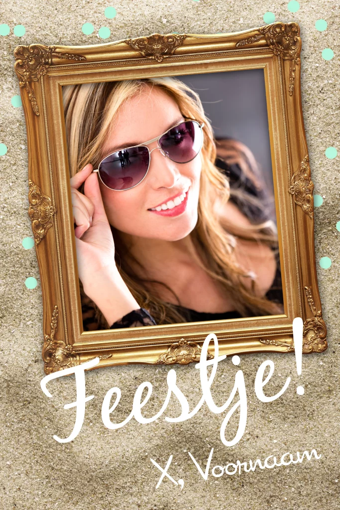 Maak zelf deze leuke uitnodiging voor je verjaardagsfeest met een zand achtergrond een hippe gouden fotolijst. Zet je eigen foto je uitnodiging en bestellen maar!