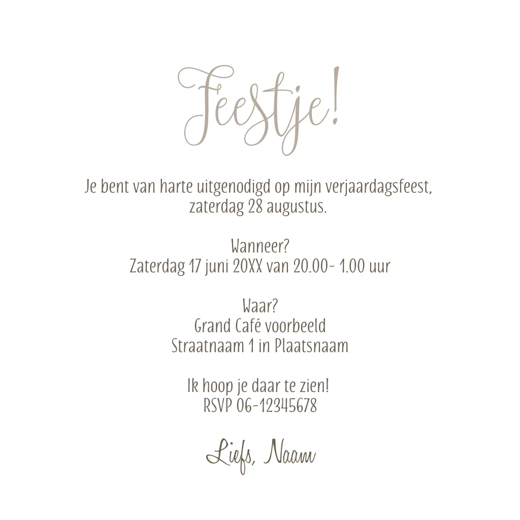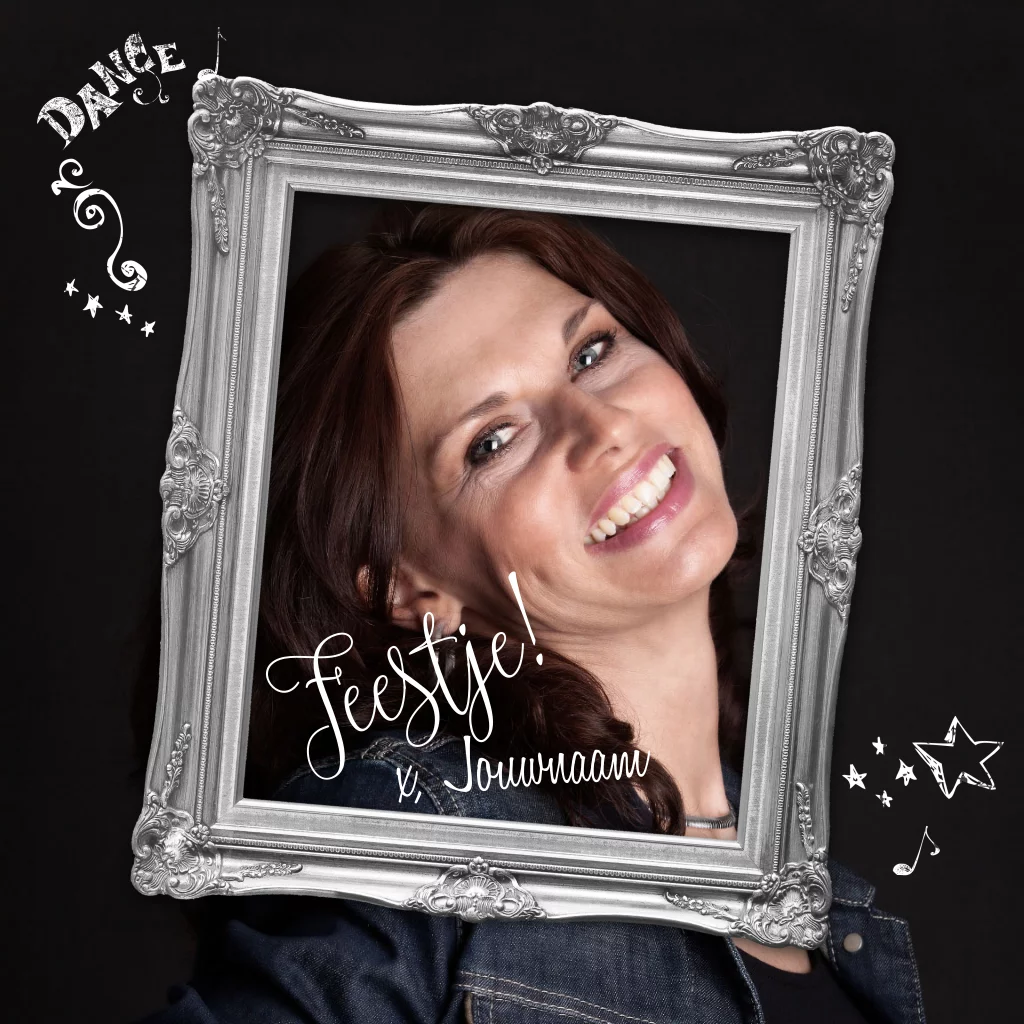 Laat je familie en vrienden weten dat je een feestje geeft met een hip en trendy uitnodigingskaartje. Plaats een leuke foto van jezelf op de achtergrond en zet het fotolijstje erbovenop. Aan de binnenzijde van de kaart staat nog een fotolijstje, plaats hier bijvoorbeeld je leeftijd of een leuke tekst.