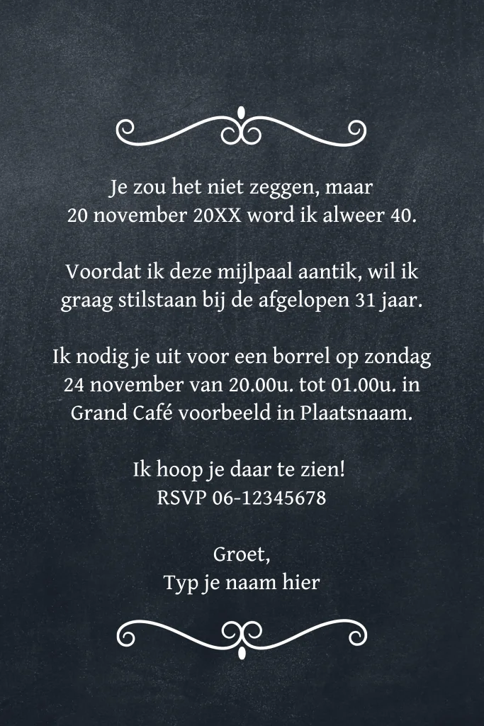 Hippe verjaardag uitnodiging voor 40 jaar met krijtbord label op een lichte achtergrond. Met leuke typografische tekst elementen.