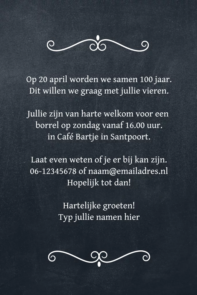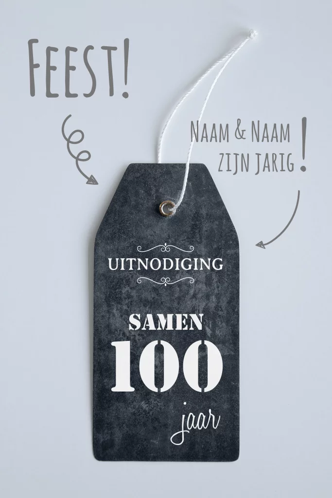 Met een leuk krijtbord label waar je de teksten en lettertypes van kan aanpassen, zo ontwerp je zelf gemakkelijk jullie speciale samen 100 uitnodiging!
