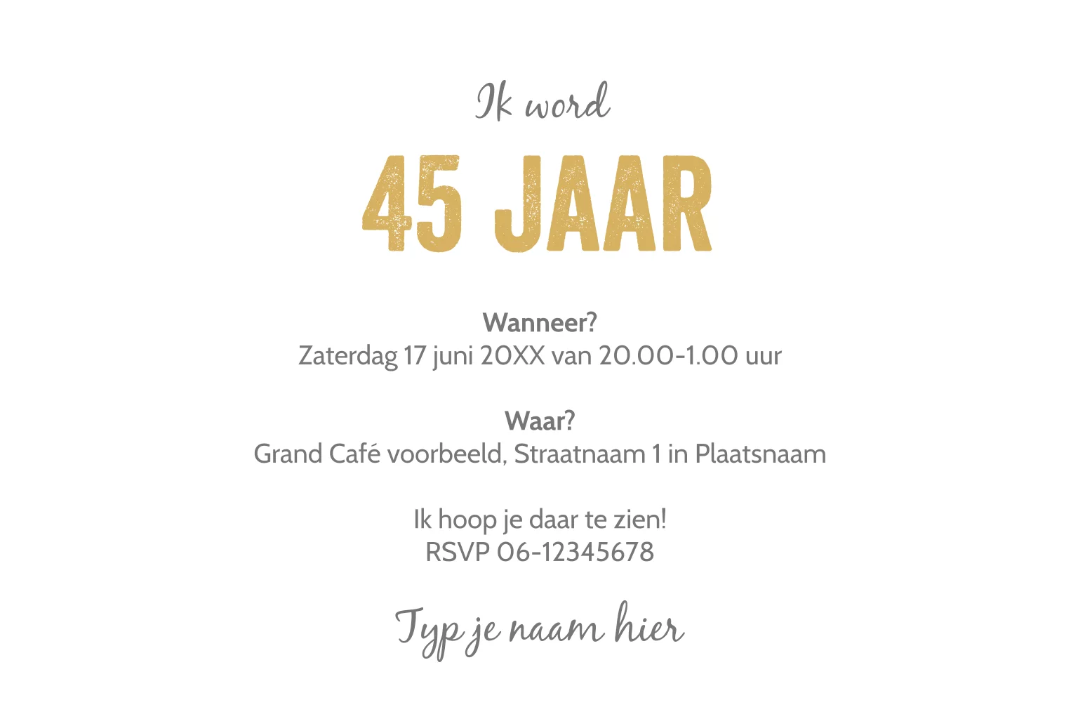 Maak zelf deze originele verjaardagsuitnodiging met jouw leeftijd en eigen originele foto's van vroeger en nu op de voorkant.