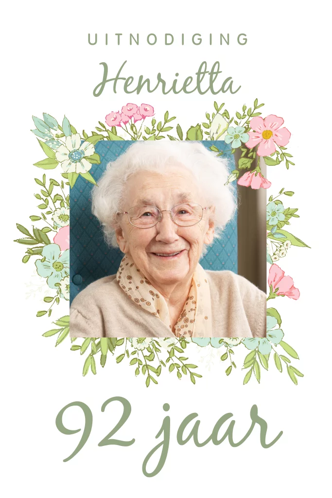 Vrolijke uitnodiging met een eigen foto en sierlijke bloemen en botanische takjes. Maak zelf je feestelijke verjaardagsuitnodiging bij Luckz.