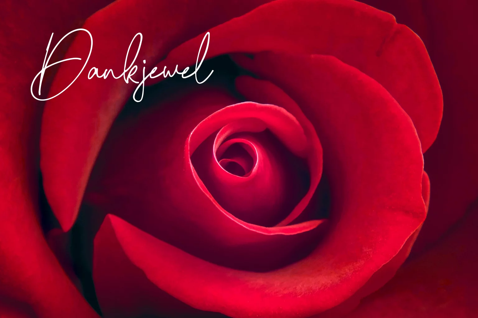 Mooie bedankkaart met een close of foto van een roos en de tekst Dankjewel. Alle teksten kun je helemaal zelf aanpassen.