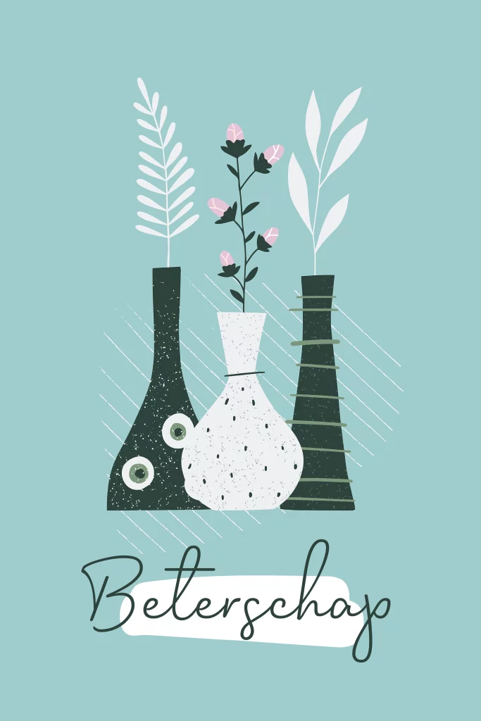 Mooie beterschap kaart die Je zelf helemaal kan personaliseren. Met stijlvolle illustratie van vazen met bloemen en takken in blauwe en groene kleuren. Met groot de tekst beterschap op de voorkant die je kan aanpassen naar ieder ander woord zoals sterkte. De mooiste beterschapskaarten maak je zelf bij Luckz.
