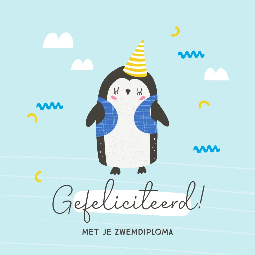 Ken je iemand die geslaagd is voor zwemdiploma A, B of C? Maak en stuur dan deze leuke felicitatiekaart voor het halen van een zwemdiploma. Met een lieve pinguin met blauwe water golfjes. Alles op deze kaart kun je zelf helemaal aanpassen.