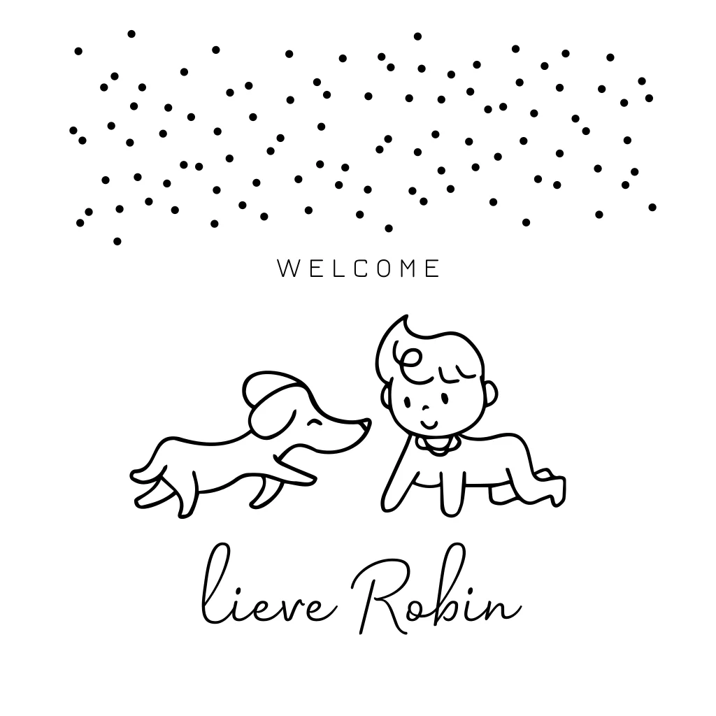 Leuke felicitatiekaart voor de geboorte van een baby. Met een hippe illustratie van de kleine met een schattig hondje en feestelijke confetti. Zet de naam van de pasgeboren baby op de voorkant. Alles op deze geboorte felicitatiekaart is aan te passen met eigen kleuren en teksten.