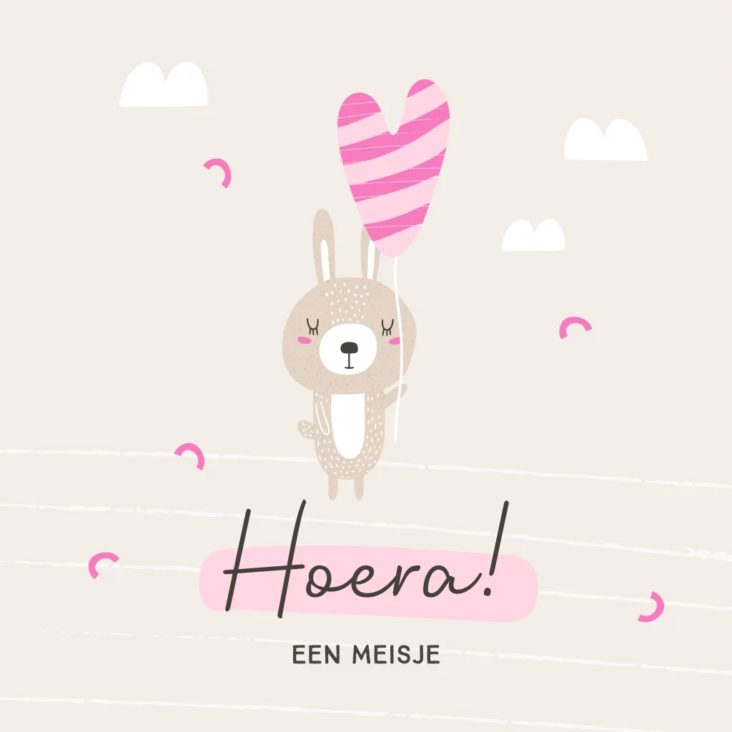 Lieve felicitatiekaart voor de geboorte van een dochter met een lief konijntje en een ballon in een hartje met streepjes rondom kleine wolkjes alles op deze roze met beige felicitatiekaart kun je zelf aanpassen.