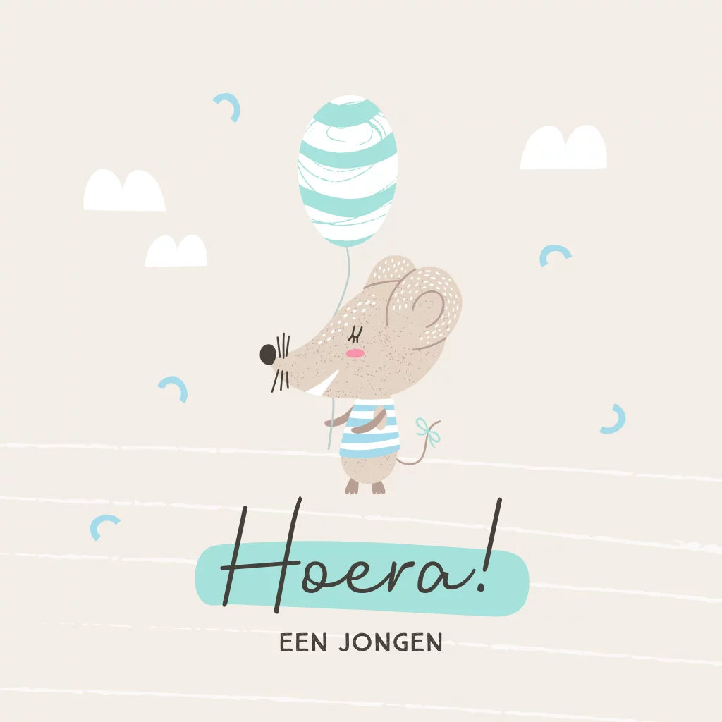 Lieve felicitatiekaart voor de geboorte van een zoon met een lief muisje met een blauw wit gestreepte ballon in de vorm van een hartje met rondom kleine wolkjes alles op dit blauw met beige felicitatiekaart kun je zelf aanpassen.