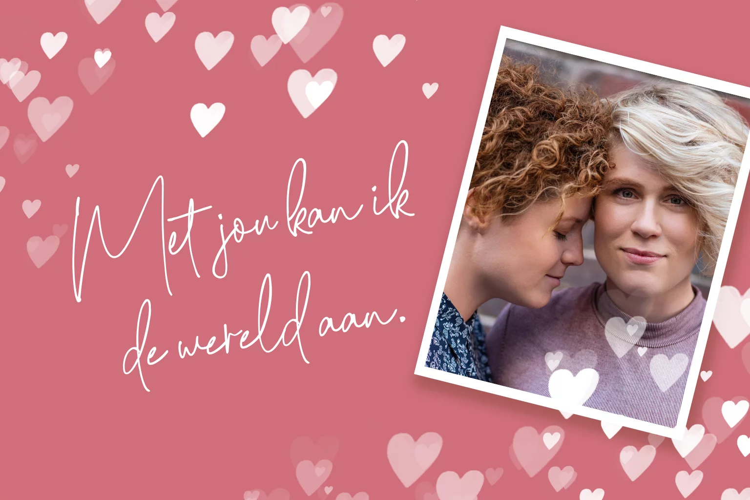 Maak zelf een lieve fotokaart met je eigen quote, foto, teksten en kleuren. Met allemaal kleine hartjes en stijlvolle lettertypes. De liefste wenskaarten maak je bij Luckz