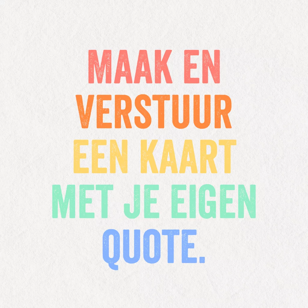 Hippe voorbeeld wenskaart met een quote in grote regenboog typografie. Maak je eigen quote kaart ontwerp. Schrijf je eigen teksten en quote, kies je kleuren en voeg versiering of een foto toe. Verstuur daarna jouw unieke creatie rechtstreeks naar de ontvanger. De leukste wenskaarten met quotes of eigen foto's en teksten maak en verstuur je zelf gemakkelijk bij Luckz.