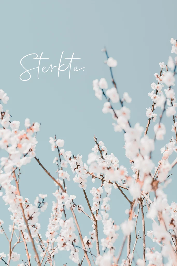 Mooie sterkte kaart met lieve bloesem takken met lichte pastel roze bloemetjes met een licht blauwe lucht. Pas zelf alle teksten aan.