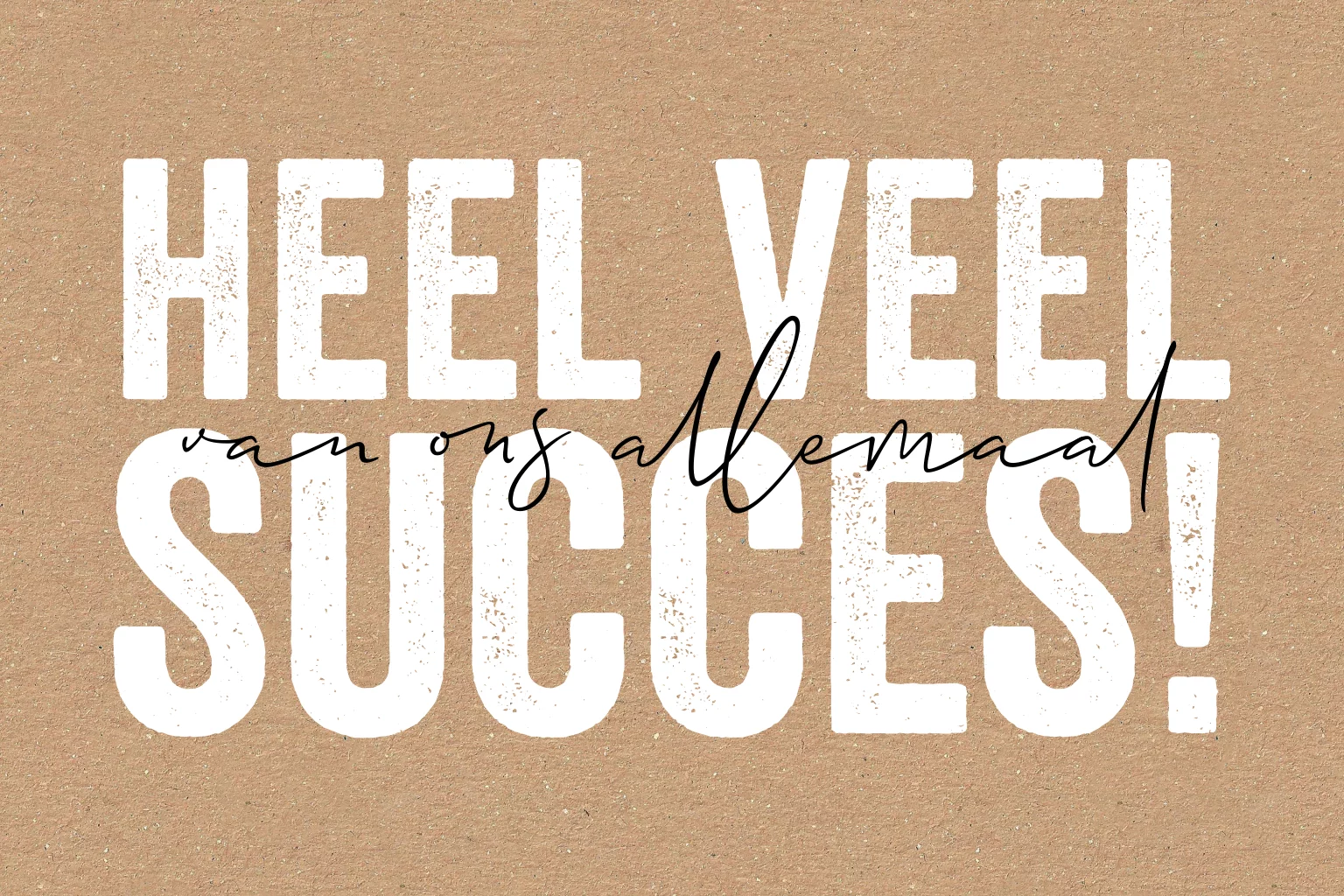 Stoere succes kaart met grote hippe typografie en de tekst: Heel veel succes van ons allemaal. Alle teksten kun je zelf personaliseren.