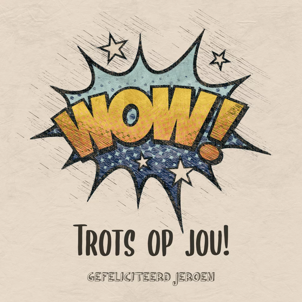 Wil je iemand laten weten dat je trots op ze bent? Maak en verstuur deze stoere vintage stijl wenskaart met coole WOW stripboek illustratie. Pas de teksten aan en verstuur deze trots op jou kaart naar iemand die geslaagd is voor een rijbewijs of bijvoorbeeld een diploma. De leukste wenskaarten maak je zelf bij Luckz!