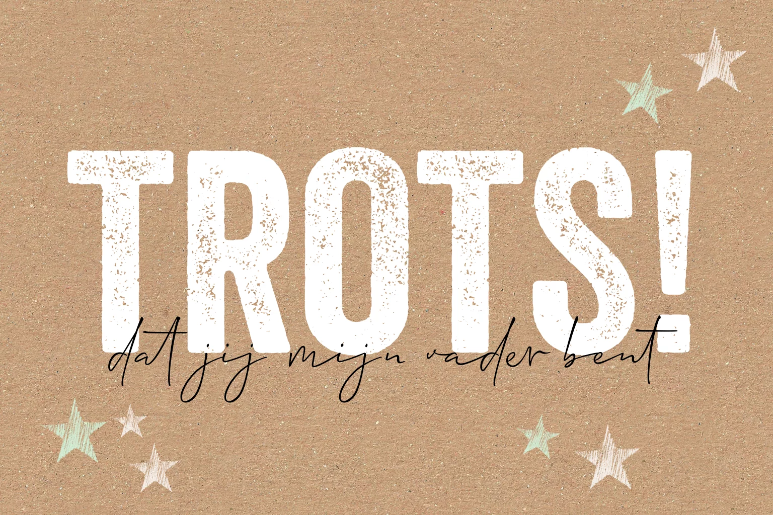 Maak zelf deze hippe kaart voor Vaderdag met groot de tekst TROTS! Dat jij mijn vader bent. Alle teksten en kleuren kun je zelf ontwerpen in de editor bij Luckz. Met mooie sterretjes rondom op een kraft look ondergrond.