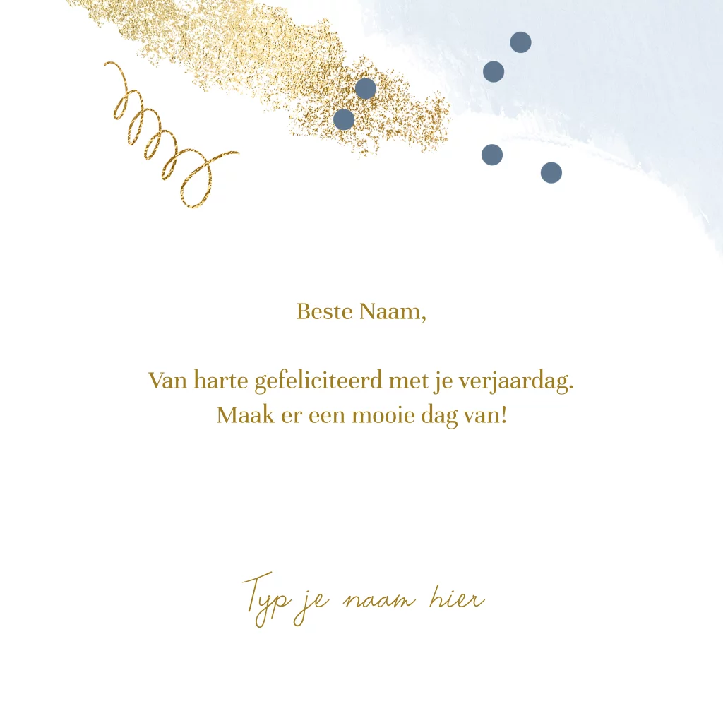Stoer chique verjaardagskaart voor een man met waterverf van donkerblauw met zwart en gouden verf vegen. Groot het woord Gefeliciteerd in goud look. Maak zelf deze stoere verjaardagskaart bij Luckz, pas alle teksten aan.