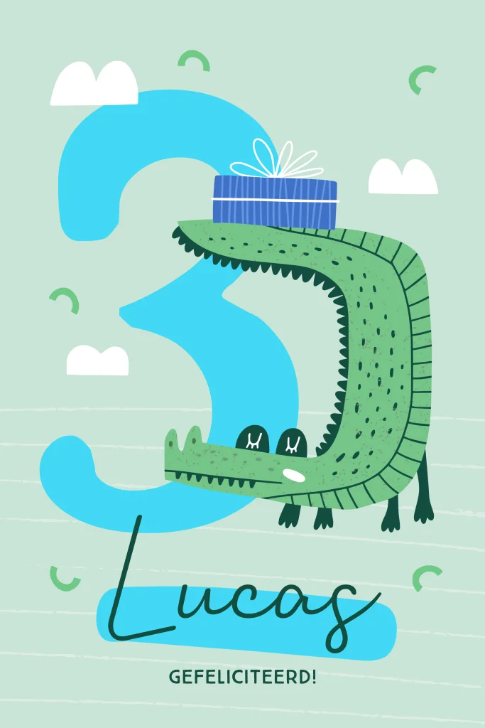 Vrolijke verjaardagskaart met aanpasbare leeftijd 3 jaar en een leuke grote krokodil met een cadeautje. Rondom leuke versieringen van wolkjes en confetti op een roze ondergrond. Alles op deze verjaardagskaart kun je zelf personaliseren. De leukste kaarten voor een verjaardag maak je zelf bij Luckz.