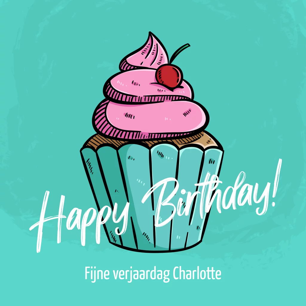Hippe verjaardagskaart met illustratie van een cupcake taartje en de tekst Happy Birthday, die je zelf kan aanpassen naar Gefeliciteerd of iets anders. Maak en verstuur de leukste verjaardagskaarten zelf bij Luckz.