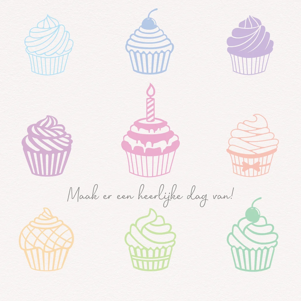 Leuke verjaardagskaart met verschillende cupcakes in pastel regenboog kleuren en de tekst: Maak er een heerlijke dag van!