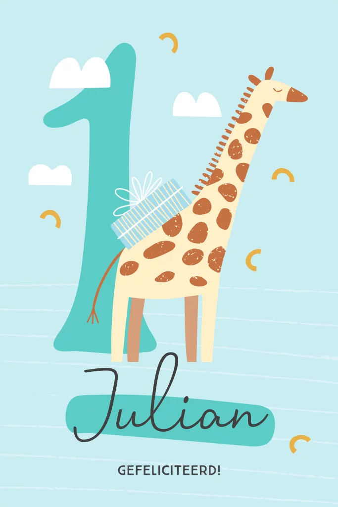 Leuke verjaardagskaart voor een kind met aanpasbare leeftijd en een grappige giraf met een cadeautje op zijn rug. Pas zelf gemakkelijk een jaar aan met ieder cijfer en pas eventueel alle kleuren aan. Typ groot de naam van de jarige op de voorkant en schrijf een lief bericht in de binnenkant. De leukste verjaardagskaarten voor 1 jaar of andere leeftijden maak je zelf bij Luckz.