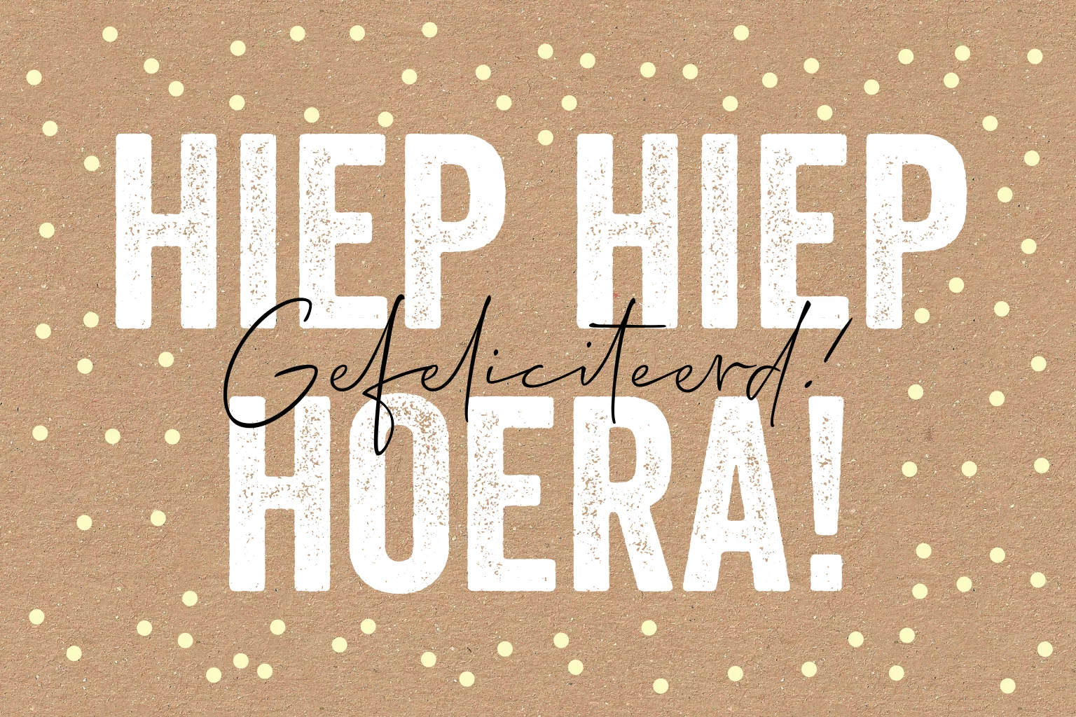 Feestelijke verjaardagskaart met Hiep Hiep Hoera gefeliciteerd in hippe grote typografische letters en feestelijke confetti rondom op een kraft look ondergrond. Schrijf een leuke tekst, versier en maak je eigen verjaardagskaart bij Luckz.