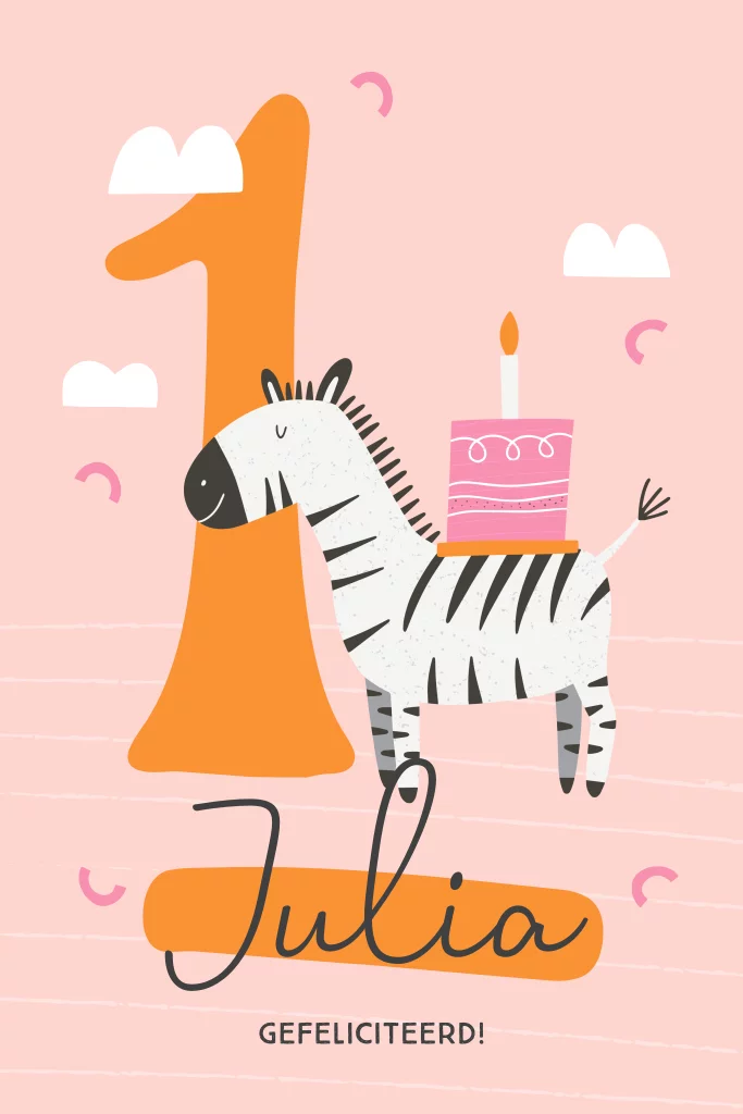 Vrolijke verjaardagskaart met aanpasbare leeftijd 1 jaar, de naam van de jarige en een feestelijke zebra met een taartje op zijn rug. Alle kleuren en teksten kun je zelf personaliseren. De leukste kaarten voor een verjaardag maak je zelf bij Luckz.