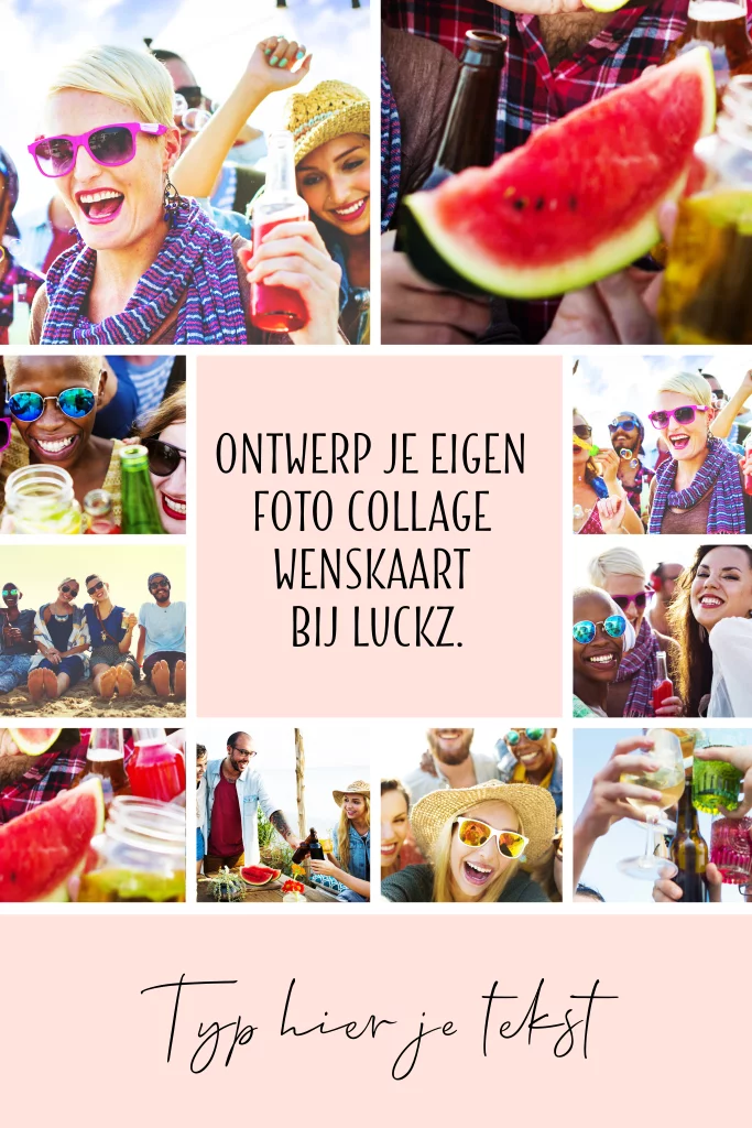 Maak je eigen foto collage kaart met wel 10 foto's. Vervang de foto's door je eigen foto's bijvoorbeeld van instagram of andere leuke foto's van je telefoon en maak deze wenskaart voor ieder moment, als verjaardagskaart, sterkte, bedank of vriendenkaart. Pas de teksten, kleuren aan en voeg versieringen toe. Let op: Zorg ervoor dat de kwaliteit van je foto's goed is. Neem bij twijfel contact op. We kijken graag met je mee. De leukste foto collage kaart maak je zelf bij Luckz